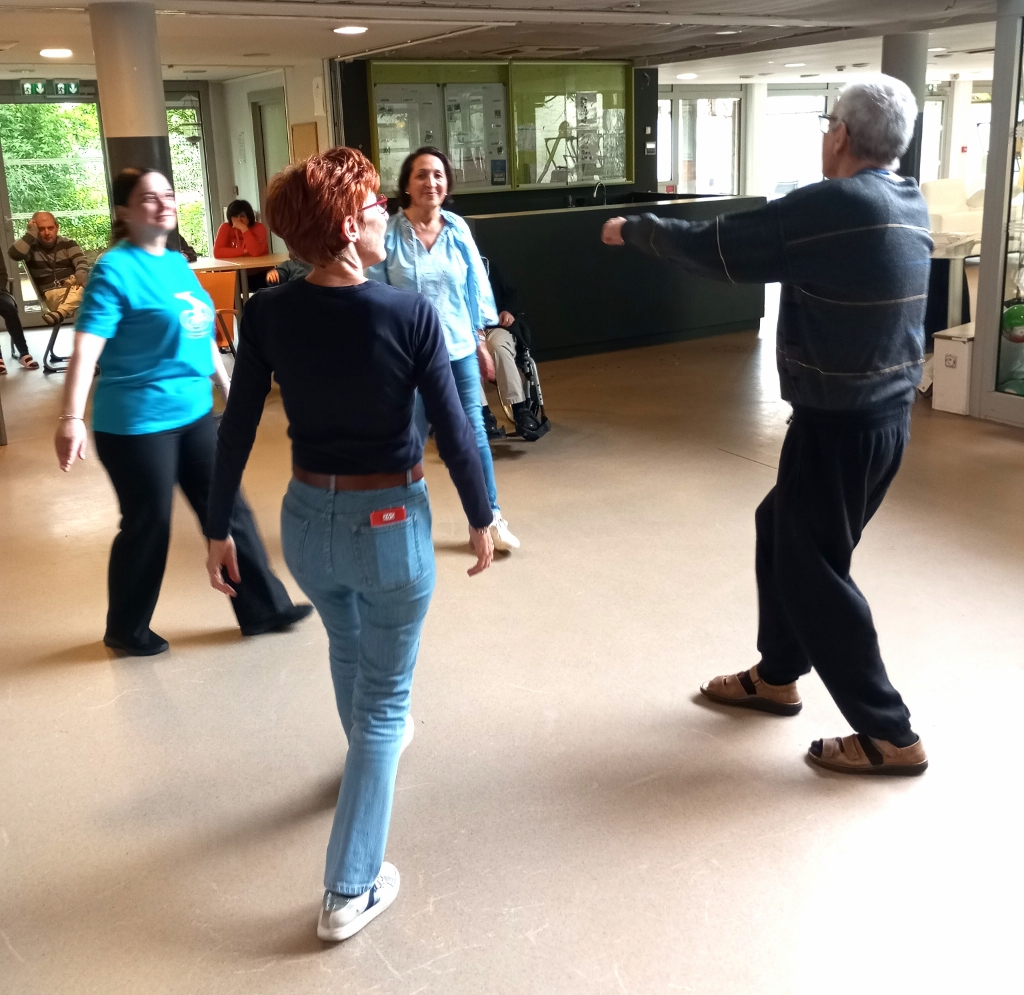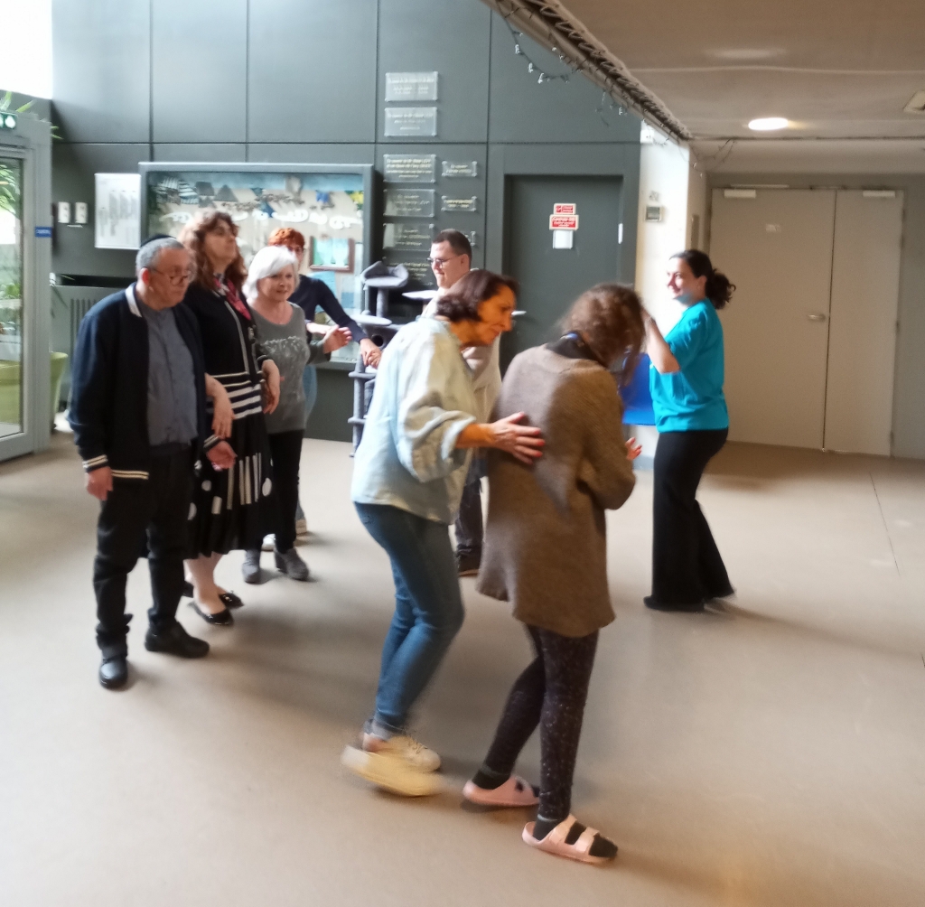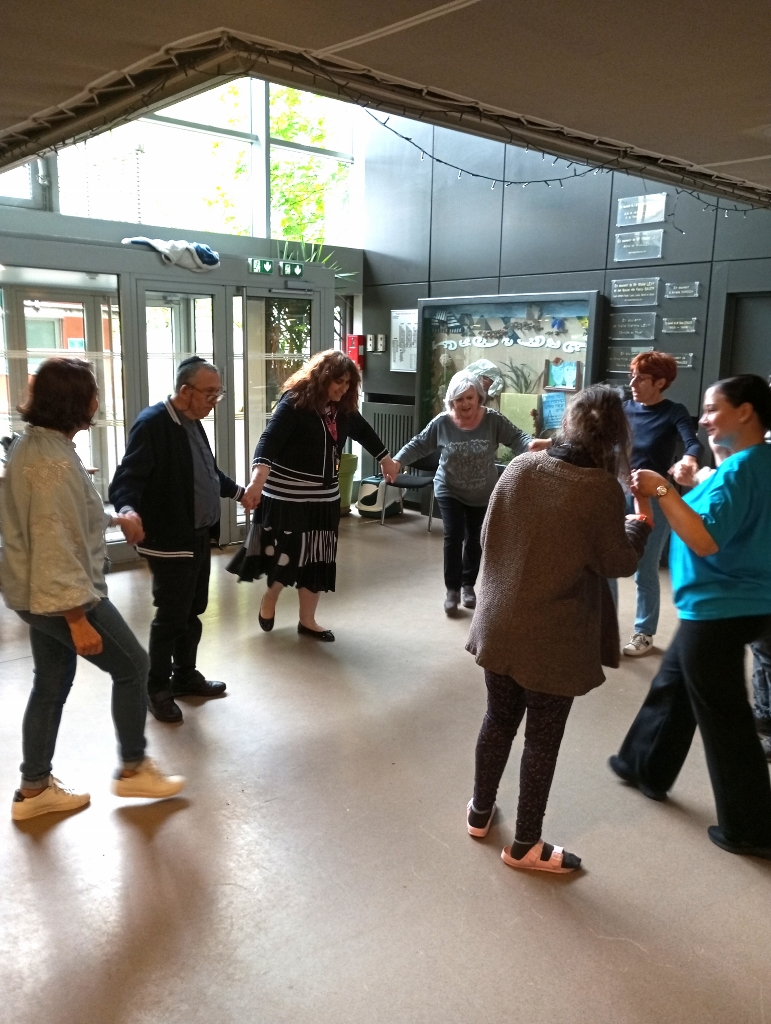Grâce à Julie animatrice du groupe Hora Simha, accompagnée d’Edith, Muriel et Martine, et après une démonstration réussie, les résidents se sont joints aux bénévoles pour danser quelques rondes du répertoire musicale israélien. Leurs sourires ont illustré le plaisir qu’ils ont pris et même les résidents qui n’ont pas oser se joindre aux danseurs ont eu la joie d’entendre de la musique dont ils connaissent quelques airs.